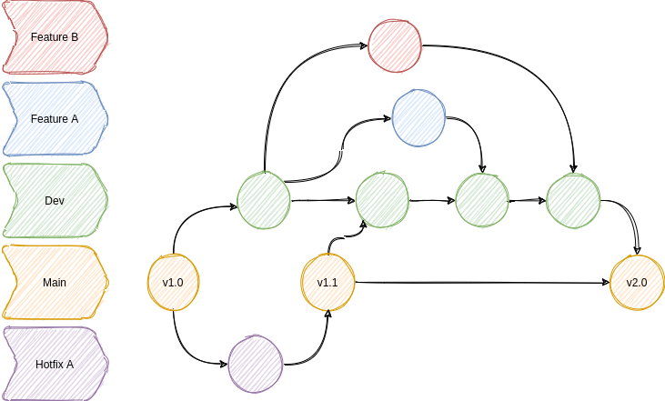 - Chaque “branche” correspond à une tâche à réaliser: un bogue à corriger (Hotfix A), une nouvelle fonctionnalité à ajouter ou un “truc à essayer” (Feature A et Feature B).